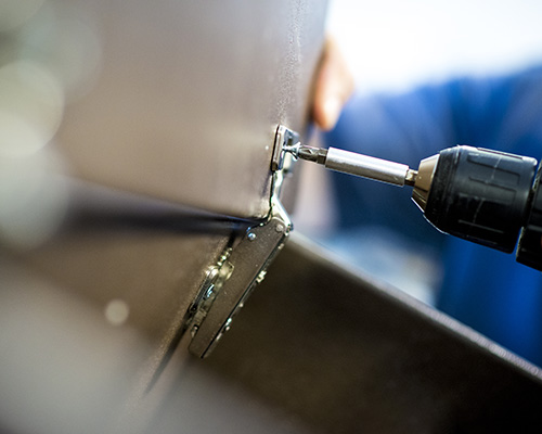 Bližnji posnetek serviserja, ki vijači tečaje omare.